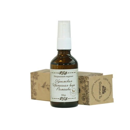 Гидролат ромашки добывается методом паровой дистилляции цветов ромашки. Обладает множеством целебных свойств, не содержит консервантов, поэтому не вызывает аллергических реакций. Особенно рекомендуется для ухода за жирной и проблемной кожей благодаря вяжущему и бактерицидному действию. Является сильным противовоспалительным средством, быстро заживляет кожу, очищает и сужает поры, нормализует гидролипидный баланс, улучшает работу сальных желез, устраняет зуд, покраснения, отеки, дерматиты, используется при солнечных и бытовых ожогах. Применяется для ухода за волосами и кожей головы. Придает волосам блеск и здоровый вид, борется с перхотью, повышенным выделением кожного сала. Цветочная вода ромашки прекрасно подходит для ухода за полостью рта. Устраняет неприятный запах, улучшает состояние десен, заживляет ранки и язвочки. Также ромашковый гидролат рекомендуется к применению при заболеваниях мочеполовой системы.