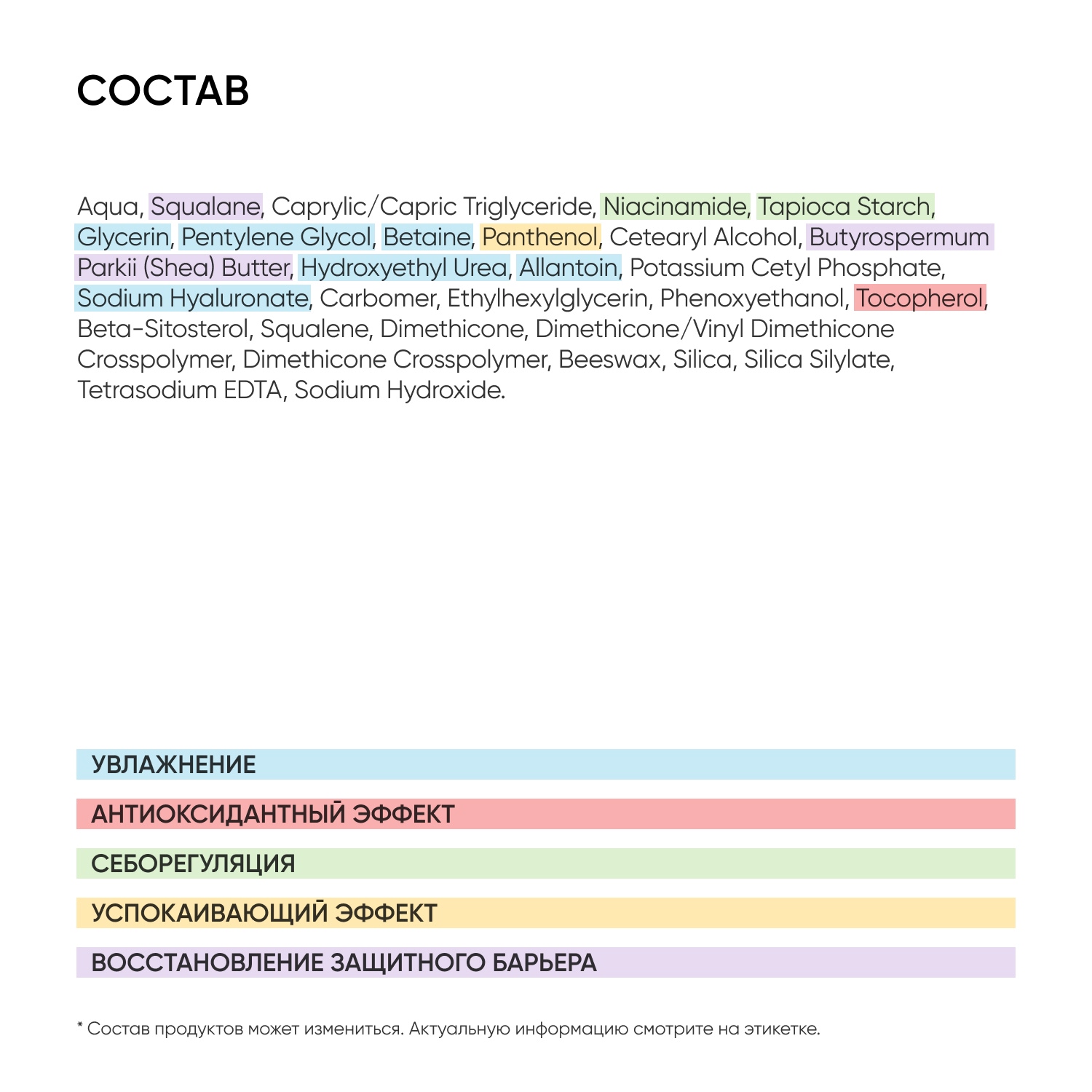 Состав: aqua, squalane, caprylic/capric triglyceride, niacinamide, tapioca starch, glycerin, pentylene glycol, betaine, panthenol, cetearyl alcohol, butyrospermum parkii (shea) butter, urea, allantoin, potassium cetyl phosphate, sodium hyaluronate, carbomer, ethylhexylglycerin, phenoxyethanol, tocopherol (mixed), beta sitosterol, squalene, dimethicone, dimethicone/vinyl dimethicone crosspolymer, dimethicone crosspolymer, beeswax, silica, silica silylate, disodium edta, sodium hydroxide.