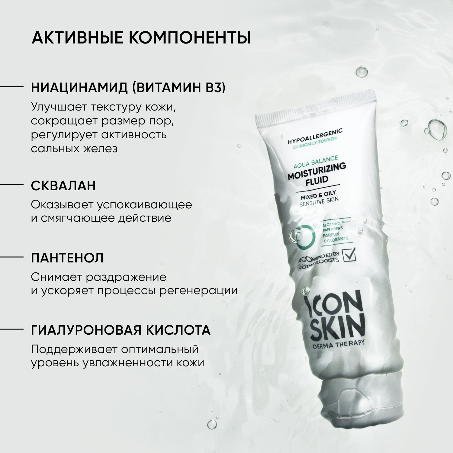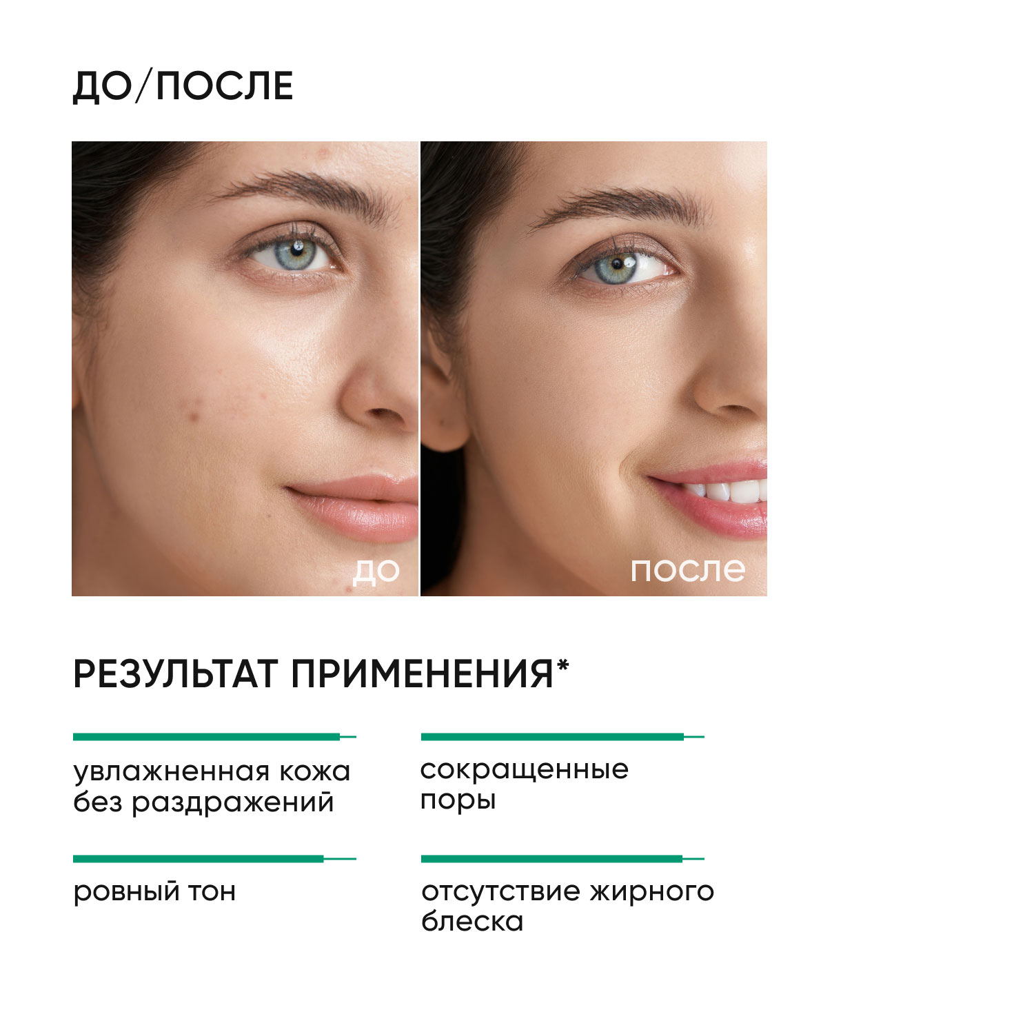 Результат применения: увлажненная кожа без раздражений, ощущения липкости и жирности.