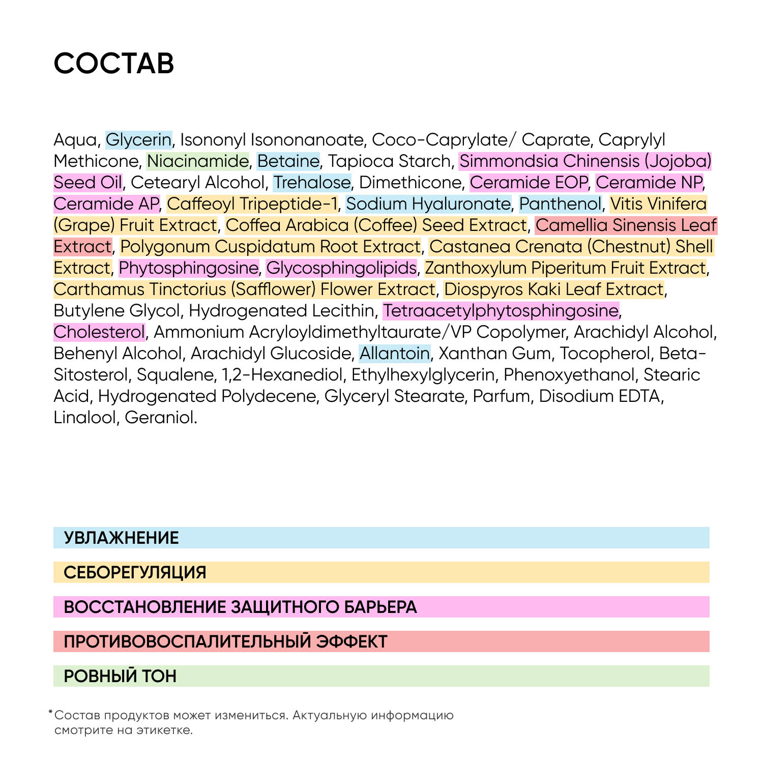 Состав: Aqua, Glycerin, Isononyl Isononanoate, Coco-Caprylate/ Caprate, Caprylyl Methicone, Niacinamide, Betaine, Tapioca Starch, Simmondsia Chinensis (Jojoba) Seed Oil, Cetearyl Alcohol, Trehalose, Dimethicone, Ceramide EOP, Ceramide NP, Ceramide AP, Caffeoyl Tripeptide-1, Sodium Hyaluronate, Panthenol, Vitis Vinifera (Grape) Fruit Extract, Coffea Arabica (Coffee) Seed Extract, Camellia Sinensis Leaf Extract, Polygonum Cuspidatum Root Extract, Castanea Crenata (Chestnut) Shell Extract, Phytosphingosine, Glycosphingolipids, Zanthoxylum Piperitum Fruit Extract, Carthamus Tinctorius (Safflower) Flower Extract, Diospyros Kaki Leaf Extract, Butylene Glycol, Hydrogenated Lecithin, Tetraacetylphytosphingosine, Cholesterol, Ammonium Acryloyldimethyltaurate/VP Copolymer, Arachidyl Alcohol, Behenyl Alcohol, Arachidyl Glucoside, Allantoin, Xanthan Gum, Tocopherol, Beta-Sitosterol, Squalene, 1,2-Hexanediol, Ethylhexylglycerin, Phenoxyethanol, Stearic Acid, Hydrogenated Polydecene, Glyceryl Stearate, Parfum, Disodium EDTA, Linalool, Geraniol