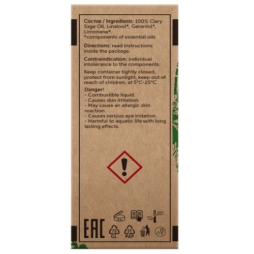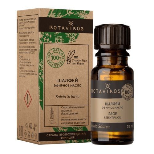 Получают из цветущих частей и листьев шалфея мускатного. Древесно-травяной холодный аромат с пряными терпкими оттенками.
