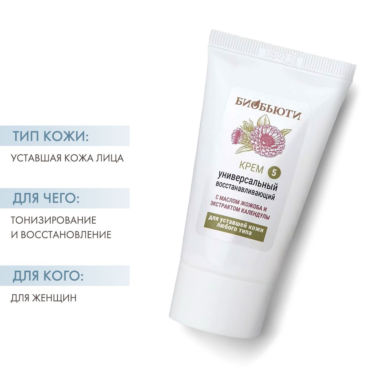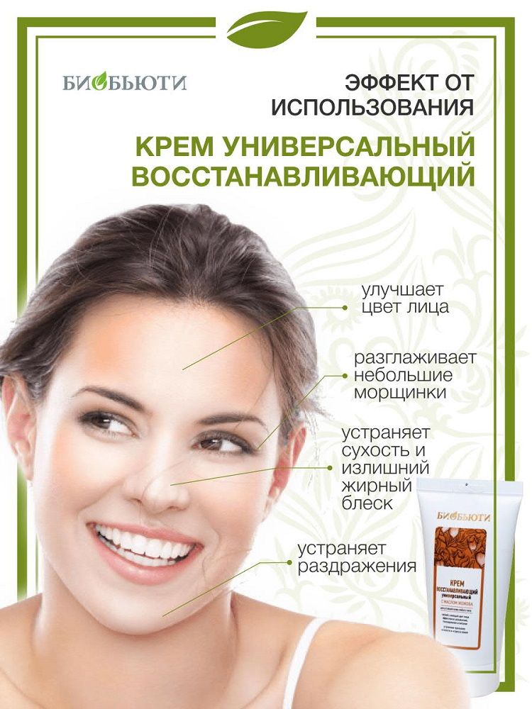 Крем для лица «Восстанавливающий универсальный» устранит вялость и усталость кожи, наполнит ее здоровьем и красотой. Средство возвращает коже упругость, тонизирует и питает ее, обладает разглаживающим действием, поэтому может использоваться как крем от морщин. Он подходит для кожи любого типа - питает и насыщает сухую кожу, нормализует работу сальных желез кожи с повышенной жирностью. Крем выравнивает цвет лица, устраняет воспаления, улучшает кровообращение. Подходит для ежедневного ухода, он может использоваться перед нанесением макияжа - быстро впитывается и создает защитный слой для кожи.