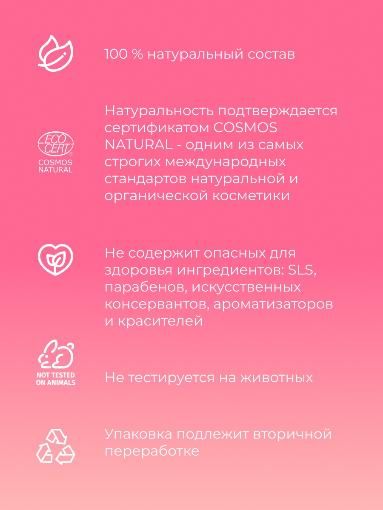 Создано из природных компонентов высокого качества. Не содержит SLS, парабенов, искусственных консервантов, ароматизаторов и красителей.