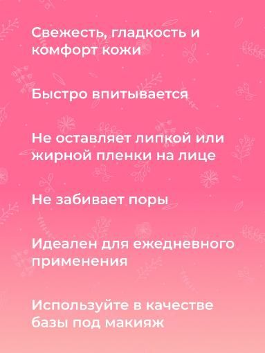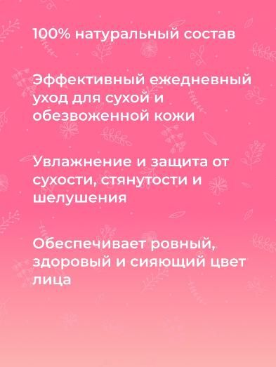Увлажняющий крем способен проникать глубоко в кожу и обеспечивать пролонгированное увлажнение, смягчение и разглаживание кожи. Обладает невесомой легкой текстурой, моментально впитывается без ощущения пленки на лице, позволяя коже дышать и не забивая поры.