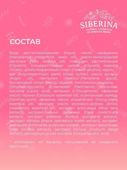 Состав: вода дистиллированная (aqua), масло макадамии (macadamia integrifolia seed оil), масло виноградной косточки (vitis vinifera oil), глицерин (glycerin), глицерил стеарат цитрат (glyceryl stearate citrate), цетилстеариловый спирт (cetearil alcohol), масло ши (вutyrospermium parkii (shea) butter), масло арганы (argan oil), пентилен гликоль (pentylene glycol), бензиловый спирт (benzyl alcohol), этилгексилглицерин (ethylhexylglycerin), д-пантенол (panthenol), молочная кислота (lactic acid), витамин е (tocopherol), эфирное масло герани (geranium essential oil), ксантановая камедь (xanthan gum), эфирное масло иланг-иланг (ylang-ylang essential oil), эфирное масло розового дерева (aniba rosaeodora essential oil), экстракт алоэ-вера (aloe vera extract), экстракт пивных дрожжей (faex medicinalis extract), экстракт рябины (sorbus aucuparia extract), экстракт яблока (mains domestica borkh extract), экстракт эхинацеи (echinacea purpurea extract), экстракт винограда (vitis vinifera extract), экстракт лопуха (arctium lappa extract), дегидроуксусная кислота (dehydroacetic acid)