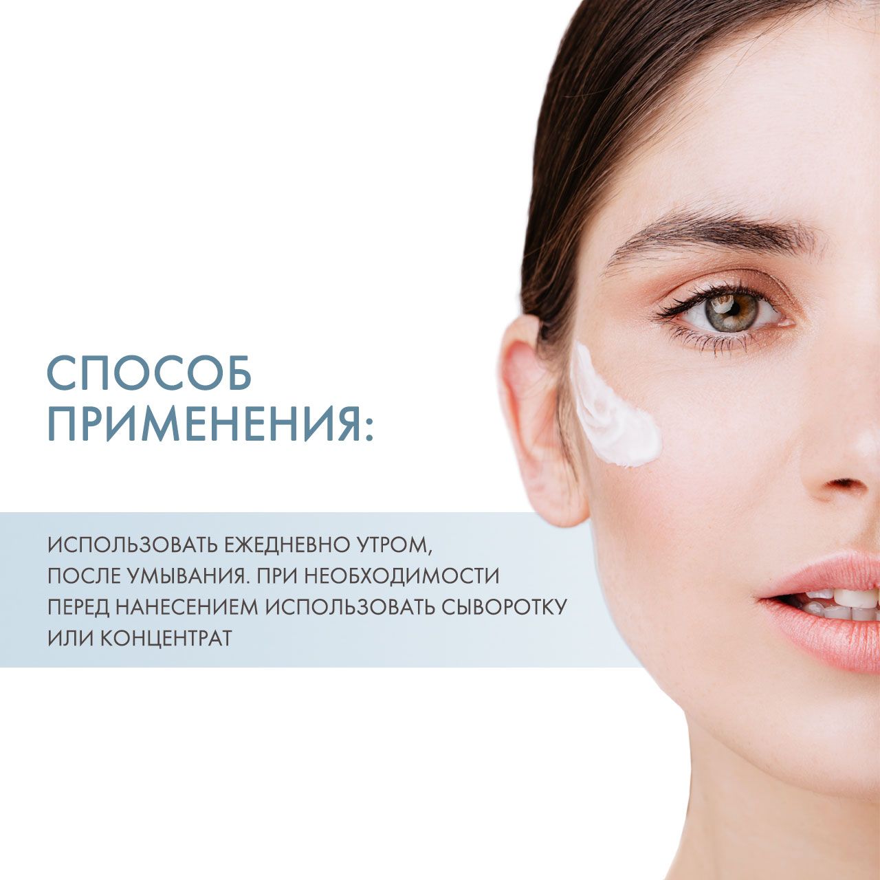 Использовать ежедневно, утром, после умывания. При необходимости перед нанесением использовать сыворотку или концентрат.