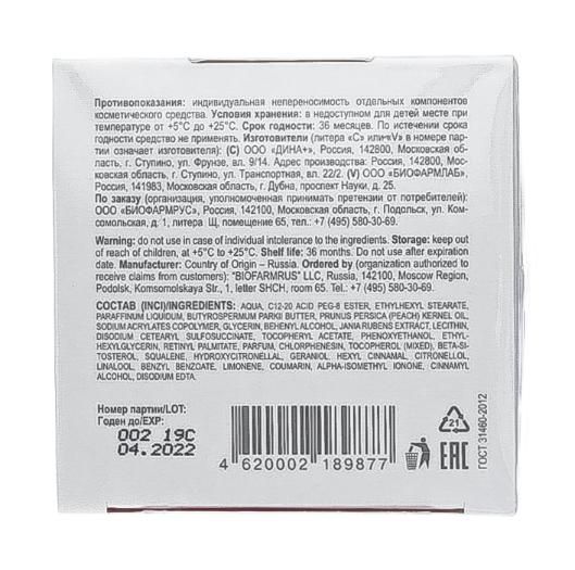Состав: aqua, c12-20 acid peg-8 ester, ethylhexyl stearate, paraffinum liquidum, butyrospermum parkii butter, prunus persica (peach) kernel oil, sodium acrylates copolymer, glycerin, behenyl alcohol, jania rubens extract, lecithin, disodium cetearyl sulfosuccinate, tocopheryl acetate, phenoxyethanol, ethylhexylglycerin, retinyl palmitate, parfum, chlorphenesin, tocopherol (mixed), beta-sitosterol, squalene, hydroxycitronellal, geraniol, hexyl cinnamal, citronellol, linalool, benzyl benzoate, limonene, coumarin, alpha-isomethyl ionone, cinnamyl alcohol, disodium edta