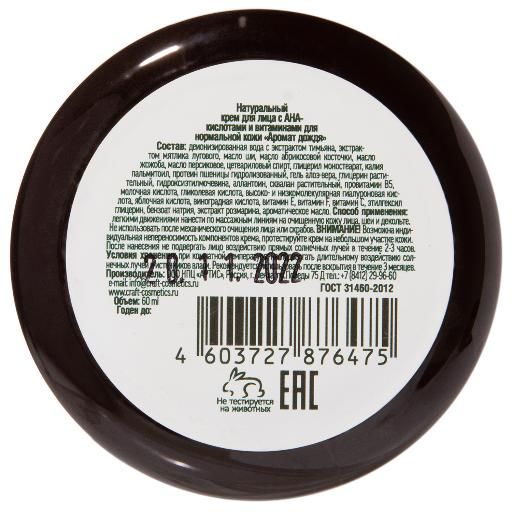 Аллантоин, глицерин, гидроксиэтил мочевина, молочная кислота, гиалуроновая кислота увлажняют максимально долгое время. АНА-кислоты (гликолевая, яблочная, молочная, виноградная) и витамины E, F и С способствуют омоложению и регенерации, оказывая увлажняющий, тонизирующий, легкий отбеливающий эффект и стимулируя выработку коллагена и эластина самой кожей. Сквалан и провитамин В5 – питают, защищают и заживляют кожу лица. Натуральный крем для нормальной кожи лица «Аромат дождя» из душного, пыльного города переносит на английский луг, где только что прошел ливень и воздух насыщен ароматами трав и цветов.