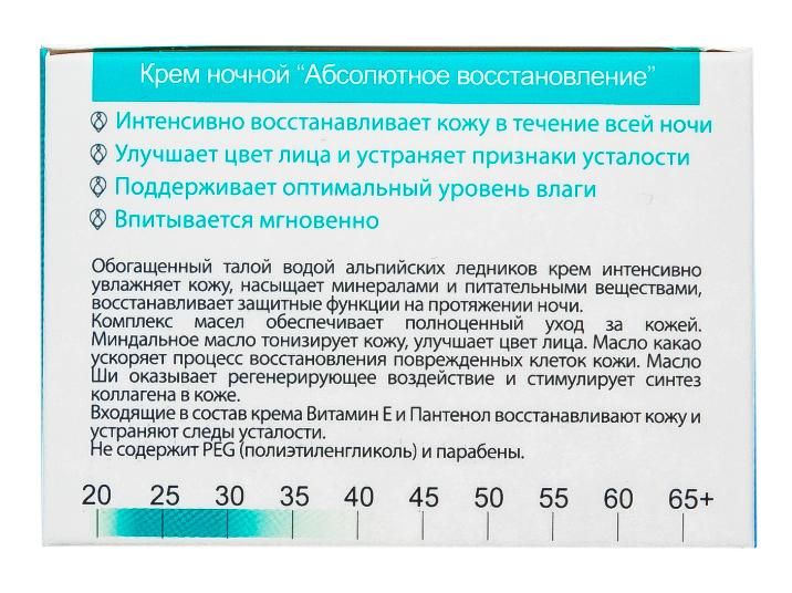 Нанесите крем утром на очищенную кожу лица легкими массажными движениями. Избегайте область вокруг глаз. Вечером используйте Крем ночной «Абсолютное восстановление».