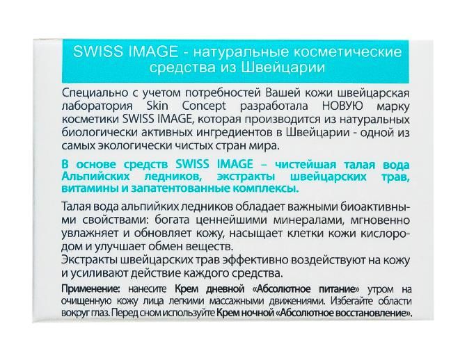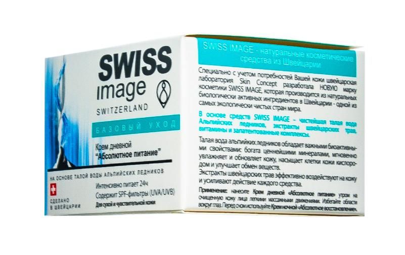 Специально с учетом потребностей кожи швейцарская лаборатория Skin Concept разработала новую марку косметики SWISS IMAGE, которая производится из натуральных биологически активных ингредиентов. Легкая текстура крема мгновенно впитывается в кожу, придавая ей шелковистость. Обогащенный талой водой Альпийских ледников крем интенсивно увлажняет кожу, насыщает минералами и питательными веществами, восстанавливает защитные функции на протяжении дня. Натуральный комплекс, содержащийся в креме, существенно повышает уровень влаги в коже и обеспечивает оптимальный уровень питания и увлажнения на 24 часа. Пантенол и экстракт эдельвейса успокаивают кожу и дарят ей комфортное ощущение, витамин Е обладает мощными антиоксидантными свойствами. Содержатся SPF фильтры (UVA/UVB). Не содержит PEG (полиэтиленгликоль) и парабены.