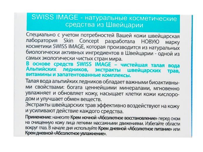 Специально с учетом потребностей кожи швейцарская лаборатория Skin Concept разработала новую марку косметики SWISS IMAGE, которая производится из натуральных биологически активных ингредиентов. Обогащенный талой водой Альпийских ледников крем интенсивно увлажняет кожу, насыщает минералами и питательными веществами, восстанавливает защитные функции на протяжении ночи. Комплекс масел обеспечивает полноценный уход за кожей. Миндальное масло тонизирует кожу, улучшает цвет лица. Масло какао ускоряет процесс восстановления поврежденных клеток кожи. Масло Ши оказывает регенерирующее воздействие и стимулирует синтез коллагена в коже. Натуральный комплекс, содержащийся в креме, существенно повышает уровень влаги в коже и обеспечивает оптимальный уровень питания и увлажнения на 24 часа. Входящие в состав крема Витамин Е и Пантенол восстанавливают кожу и устраняют следы усталости. Насыщенная текстура крема мгновенно впитывается, не оставляет жирный блеск и питает кожу на протяжении всей ночи. Витамин Е обладает антиоксидантными свойствами. Пантенол и экстракт Эдельвейса успокаивают кожу и дарят ей комфортное ощущение. Не содержит PEG (полиэтиленгликоль) и парабенов.