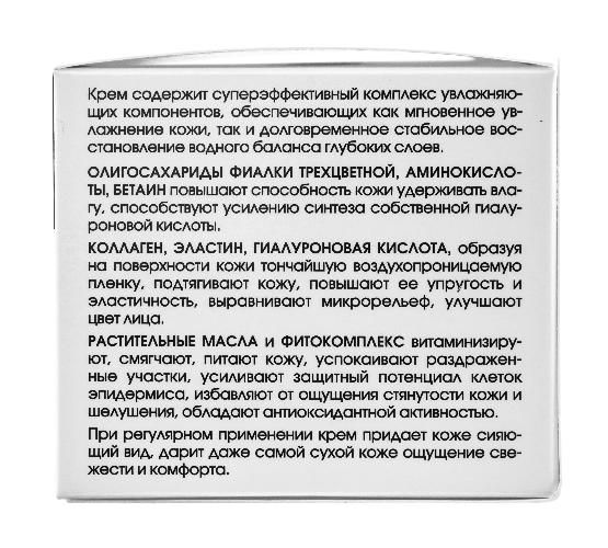 Фиалка трехцветная повышает способность кожи удерживать влагу, одуванчик, овес, фукус, аминокислоты, кислота гиалуроновая, коллаген, эластин повышают упругость и эластичность кожи, бетаин, масла ши, виноградное смягчают и питают кожу, избавляют от ощущения стянутости и шелушения.