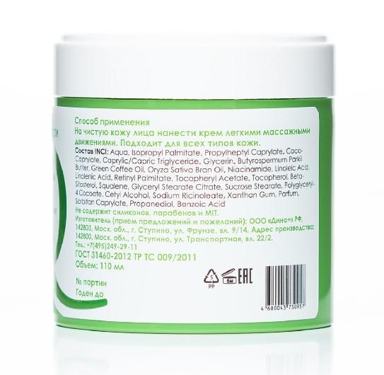 Состав: aqua, isopropyl palmitate, propylheptyl caprylate, coco-caprylate, caprylic/capric triglyceride, glycerin, butyrospermum parkii butter, green coffee oil, oryza sativa bran oil, niacinamide, linoleic acid, linolenic acid, retinyl palmitate, tocopheryl acetate, tocopherol, beta-sitosterol, squalene, glyceryl stearate citrate, sucrose stearate, polyglyceryl-4 cocoate, cetyl alcohol, sodium ricinoleate, xanthan gum, parfum, sorbitan caprylate, propanediol, benzoic acid.