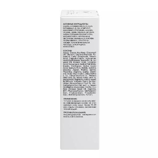 Состав: Aqua, CocosNucifera (Coconut) Oil, Glycerin, Glyceryl Stearate, Potassium Cetyl Phosphate, Stearic Acid, Caprylic/Capric Triglyceride, Urea, Soybean oil, linseed oil, linoleic acid, linolenicasid, tocopherol, retinylpalmitate, Kaolin, Alpha Lipoic Acid, Sodium PCA, Betain, Sorbitol, Glycine, Alanin, Proline, Serine, Theonine, Arginine, Lysine, Glutamic Acid, Myo-inositol, Oriza sativa L. Extract, Citrus limonium Extract, Hedera Helix (Ivy) Extract, Morus Alba Leaf Extract, Hamamelisvirginiana (witch hazel) extract,TriticumVulgare Germ Extract, Vacciniummacrocarpon Fruit Extract, ArctostaphylosUvaUrsi Leaf Extract, PerseaGratissima (Avocado) Oil,VitisVinifera (Grape) Seed Oil, Arginine, ВНТ, Phenoxyethanol, Methylparaben, Ethylparaben, Propylparaben, DMDM Hydantoin, Parfum.