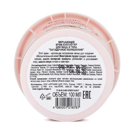 Состав: aqua, caprylic/capric triglyceride, glyceryl stearate, cetearyl alcohol, oenothera biennis oil (органическое масло примулы вечерней), glycerin, helianthus annuus seed oil, caryocar brasiliense fruit oil (масло пекуи), pearl powder (жемчужная пудра), mica, titanium dioxide, xanthan gum, tocopherol (витамин е), sodium stearoyl glutamate, dehydroacetic acid, benzyl alcohol, sodium benzoate, potassium sorbate, parfum, ci 77742.