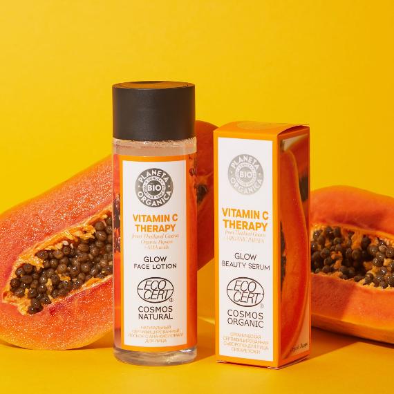 Гуава содержит в 10 раз больше витамина С, чем апельсин. Витамин С из органического масла гуавы заряжает кожу энергией, подчеркивает и усиливает естественное здоровое сияние, придавая лицу ровный тон. Органический экстракт папайи содержит натуральный энзим папаин, который освобождает кожу от токсинов, обновляет и омолаживает, делая ее гладкой и бархатистой.