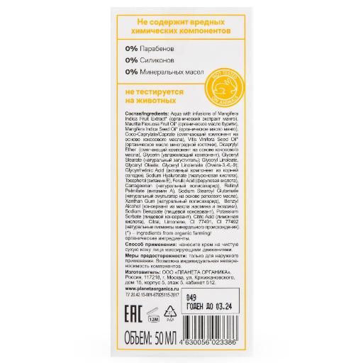 Состав: aqua with infusions of mangifera indica fruit extract* (органический экстракт манго), mauritia flexuosa fruit oil* (органическое масло бурити), mangifera indica seed oil* (органическое масло манго), coco-caprylate/caprate (смягчающий компонент на основе кокосового масла), vitis vinifera seed oil* (органическое масло виноградной косточки), dicaprylyl ether (смягчающий компонент на основе кокосового масла), glycerin (увлажняющий компонент), glyceryl stearate (натуральный загуститель); glyceryl linoleate, glyceryl oleate, glyceryl linolenate (омега -3,-6,-9); glycyrrhetinic acid (активный компонент из корней солодки), sodium hyaluronate (гиалуроновая кислота), tocopherol (витамин е), ferulic acid (феруловая кислота), carrageenan (натуральный полисахарид), retinyl palmitate (витамин а), sodium stearoyl glutamate (натуральный эмульгатор на основе рапсового масла), xanthan gum (натуральный полисахарид), benzyl alcohol (консервант из масла жасмина и гвоздики), sodium benzoate (пищевой консервант), potassium sorbate (пищевой консервант), citric acid (лимонная кислота), citral, limonene, ci 77491, ci 77492 (натуральные пигменты минерального происхождения).