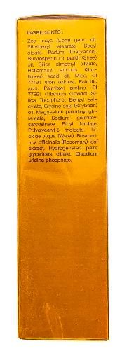 Масло содержит множество натуральных питательных компонентов и мельчайших светоотражающих частиц, масло имеет нежный аромат лимона и пачулей. Масло кукурузы.