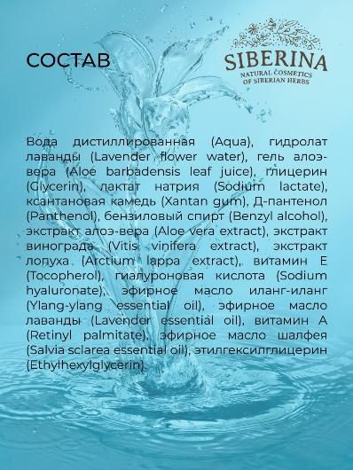 Состав: вода дистиллированная (aqua), гидролат лаванды (lavender flower water), гель алоэ-вера (aloe barbadensis leaf juice), глицерин (glycerin), лактат натрия (sodium lactate), ксантановая камедь (xantan gum), д-пантенол (panthenol), бензиловый спирт (benzyl alcohol), экстракт алоэ-вера (aloe vera extract), экстракт винограда (vitis vinifera extract), экстракт лопуха (arctium lappa extract), витамин е (tocopherol), гиалуроновая кислота (sodium hyaluronate), эфирное масло иланг-иланг (ylang-ylang essential oil), эфирное масло лаванды (lavender essential oil), витамин а (retinyl palmitate), эфирное масло шалфея (salvia sclarea essential oil), этилгексилглицерин (ethylhexylglycerin)