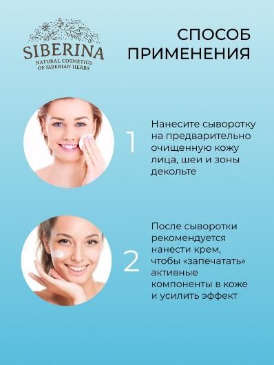 Нанести небольшое количество сыворотки легкими массажными движениями на чистую и сухую кожу лица до использования крема. Можно использовать разово, курсами и постоянно.