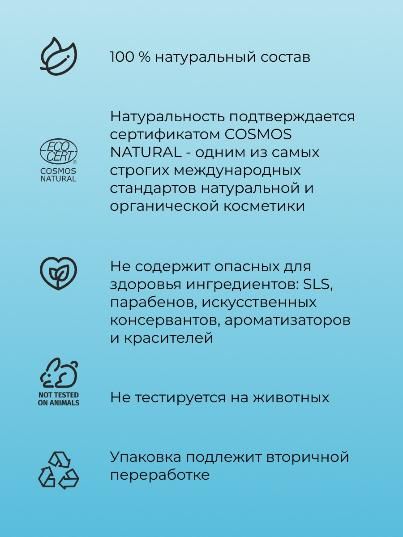 Создано из природных компонентов высокого качества. Не содержит SLS, парабенов, искусственных консервантов, ароматизаторов и красителей.