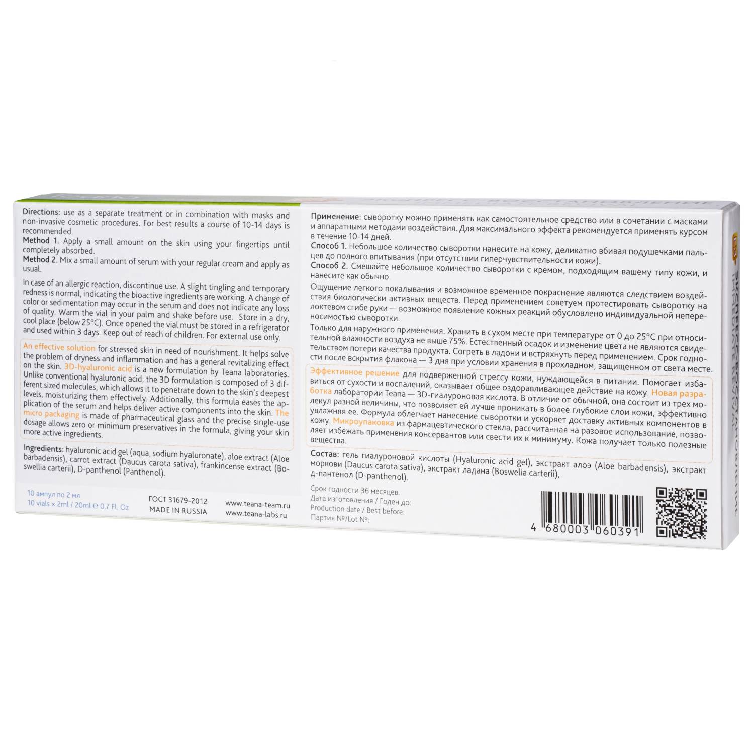 Гель гиалуроновой кислоты (hyaluronic acid gel), Вода очищенная (aqua), Алоэ (aloe barbadensis), Морковь (daucus carota), Ладан (boswellia carteri), Д-пантенол (d-panthenol).