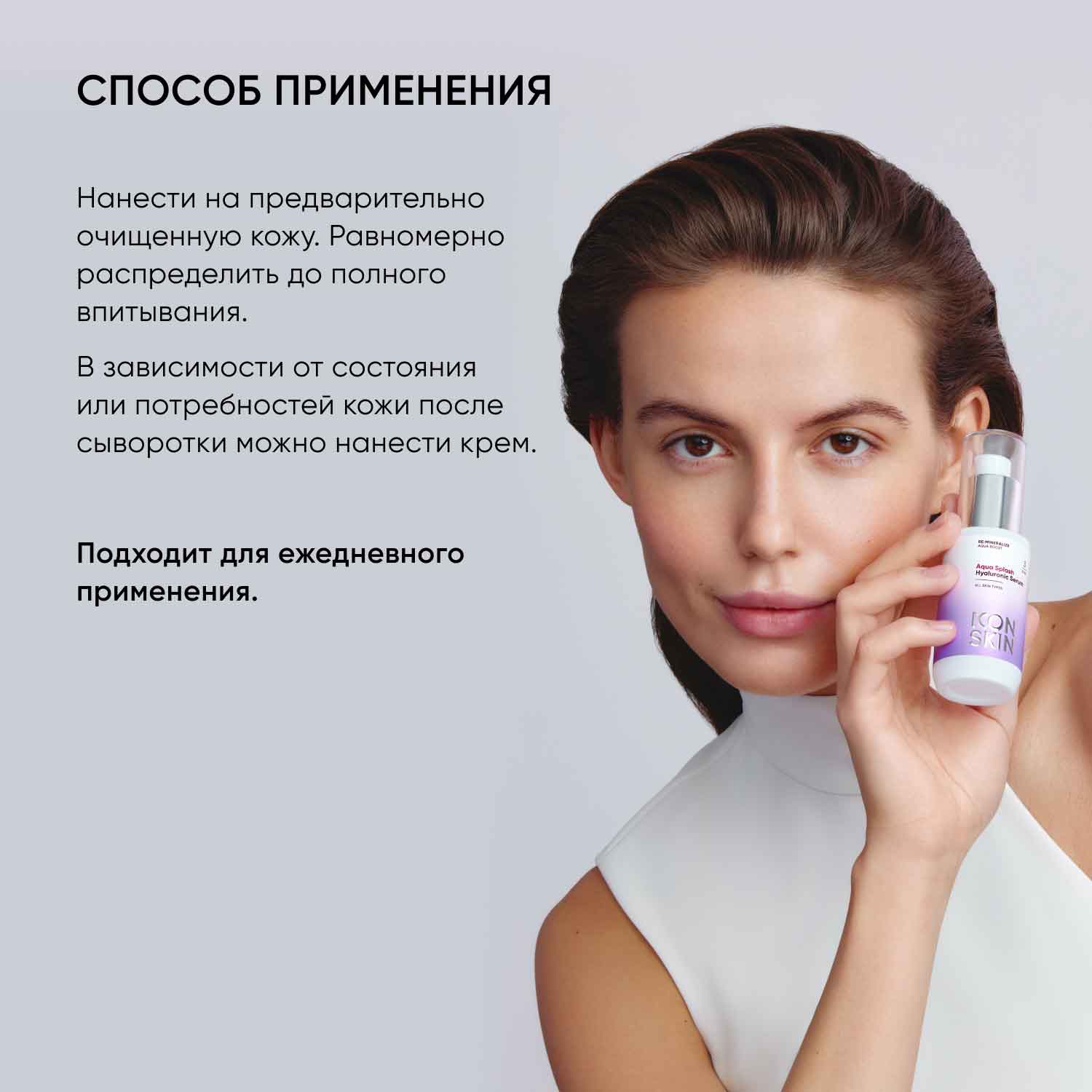 Нанести на предварительно очищенную кожу. Равномерно распределить до полного впитывания. В зависимости от состояния или потребностей кожи после сыворотки можно нанести крем. Подходит для ежедневного применения