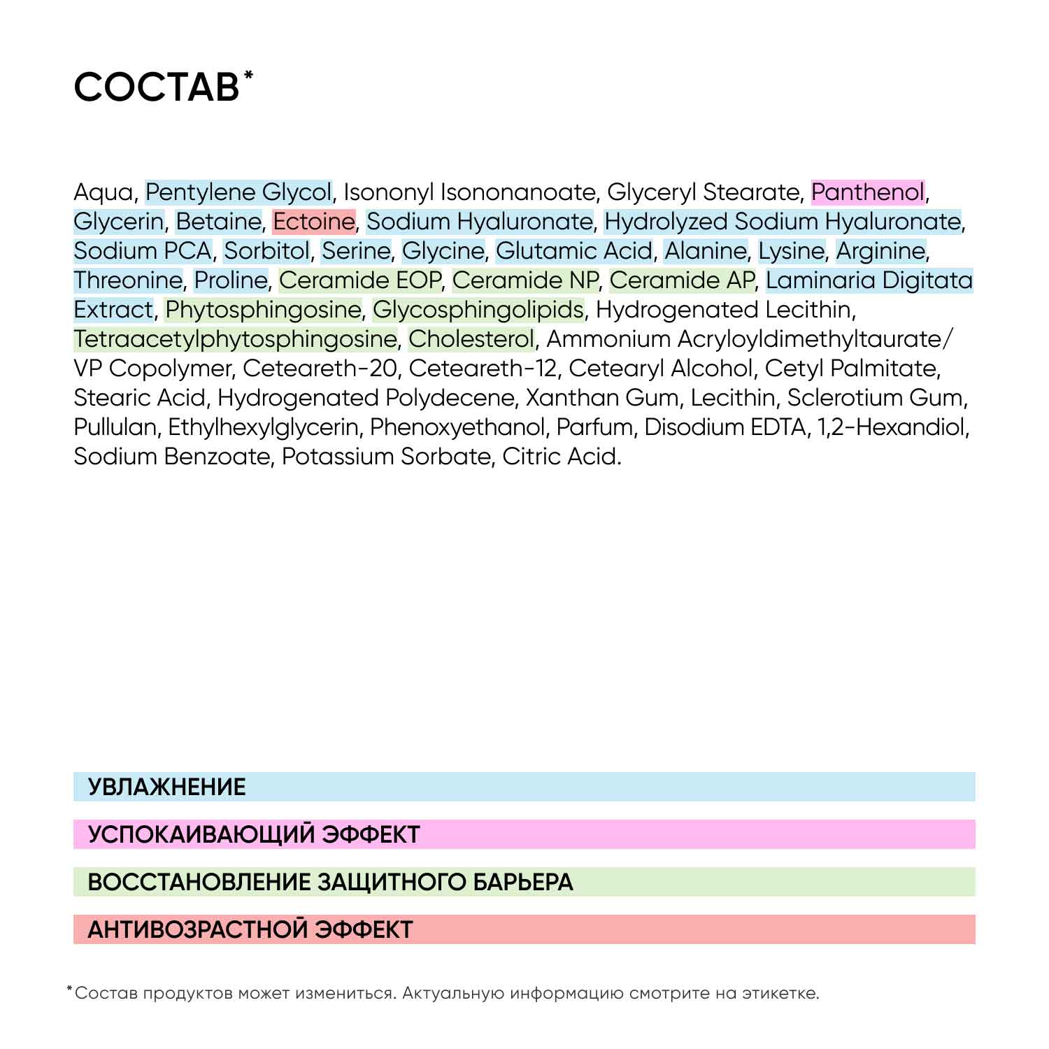 Состав: aqua, pentylene glycol, isononyl isononanoate, glyceryl stearate, panthenol, glycerin, betaine, ectoine, sodium hyaluronate, hydrolyzed sodium hyaluronate, sodium pca, sorbitol, serine, glycine, glutamic acid, alanine, lysine, arginine, threonine, proline, ceramide eop, ceramide np, ceramide ap, laminaria digitata extract, phytosphingosine, glycosphingolipids, hydrogenated lecithin, tetraacetylphytosphingosine, cholesterol, ammonium acryloyldimethyltaurate/vp copolymer, ceteareth-20, ceteareth-12, cetearyl alcohol, cetyl palmitate, stearic acid, hydrogenated polydecene, xanthan gum, lecithin, sclerotium gum, pullulan, ethylhexylglycerin, phenoxyethanol, parfum, disodium edta, 1,2-hexandiol, sodium benzoate, potassium sorbate, citric acid.