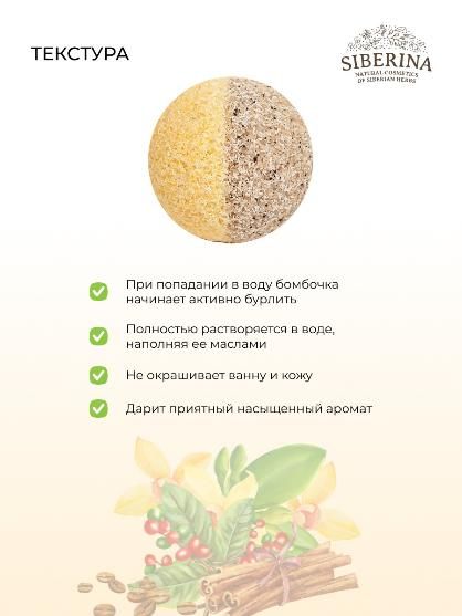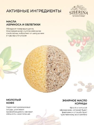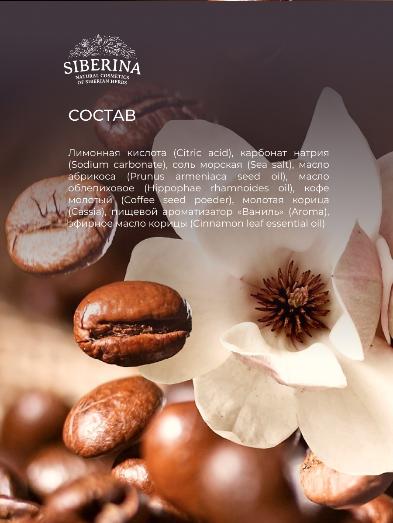 Состав: лимонная кислота (citric acid), карбонат натрия (sodium carbonate), соль морская (sea salt), масло абрикоса (prunus armeniaca seed oil), масло облепиховое (hippophae rhamnoides оil), кофе молотый (coffee seed poeder), молотая корица (cassia), пищевой ароматизатор "ваниль" (aroma), эфирное масло корицы (cinnamon leaf essential oil)