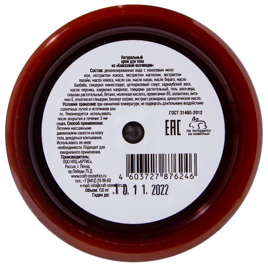 Деионизированная вода с кокосовым молоком, экстрактом кокоса, экстрактом магнолии, экстрактом папайи, масло кокоса, масло ши, масло какао, масло бораго, масло баобаба, глицерил моностеарат, цетеариловый спирт, карнаубский воск, масло персика, каприлил каприлат, глицерин растительный, гель алоэ-вера, сквалан растительный, бетаин, молочная кислота, провитамин В5, аллантоин, витамин Е, этилгексил глицерин, бензоат натрия, экстракт розмарина, ароматическое масло.