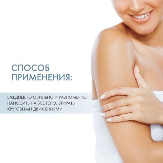 Нанесите достаточное количество средства на чистую сухую кожу тела, распределите круговыми движениями. Подходит для ежедневного применения.
