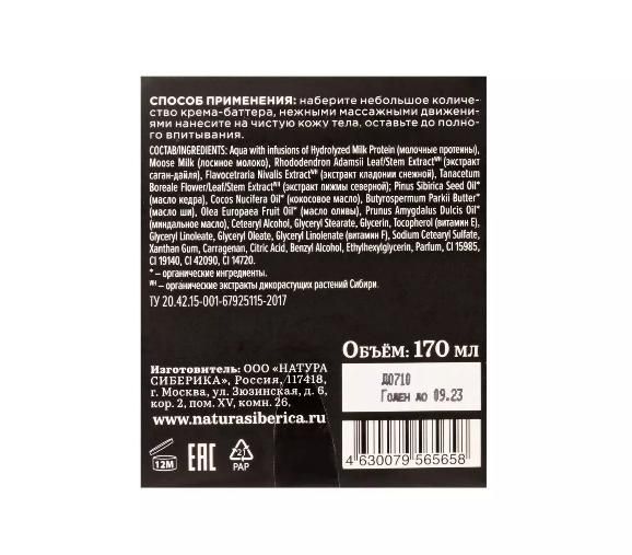 Состав: aqua with infusions of hydrolyzed milk protein (молочные протеины), moose milk (лосиное молоко), rhododendron adamsii leaf/stem extract WH* (экстракт саган-дайля), cetraria nivalis extract WH* (экстракт кладонии снежной), tanacetum boreale flower/leaf/stem extract WH* (экстракт пижмы северной), pinus sibirica seed oil (масло кедра), cocos nucifera oil (кокосовое масло), butyrospermum parkii butter (масло ши), olea europaea fruit oil (масло оливы), prunus amygdalus dulcis oil (миндальное масло), cetearyl alcohol, glyceryl stearate, glycerin, tocopherol (витамин е), glyceryl linoleate, glyceryl oleate, glyceryl linolenate (витамин f), sodium cetearyl sulfate, xanthan gum, carragenan, citric acid, benzyl alcohol, sodium benzoate, potassium sorbate, parfum