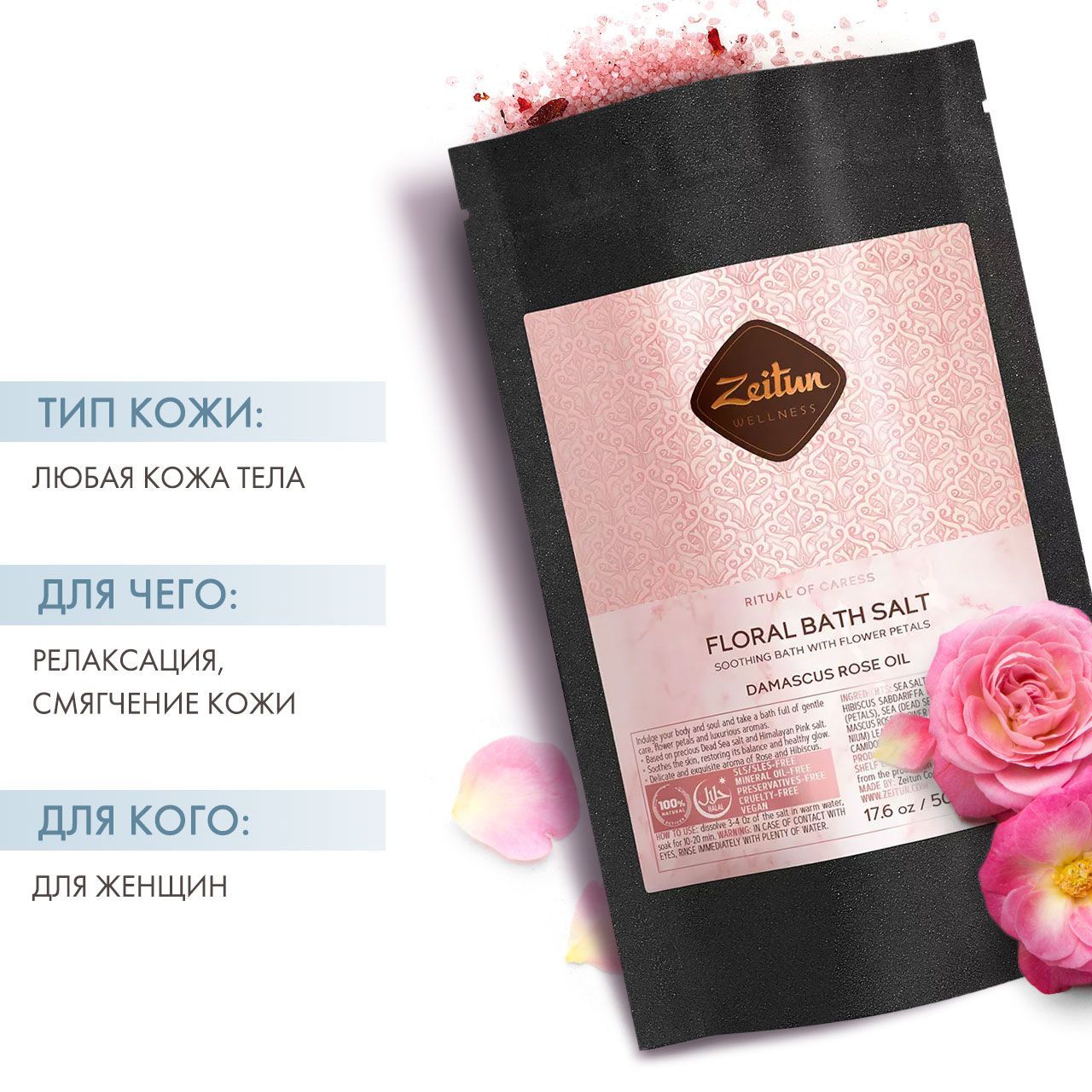 Окружите себя нежностью и заботой роскошных цветов с благоухающей цветочной солью для ванн, обогащенной эфирными маслами, лепестками дамасской розы и гибискуса. Ванна идеальна для самой требовательной кожи, успокаивает, способствует сохранению достаточного уровня увлажненности, смягчает и улучшает цвет кожи. Соль насыщает клетки бесценными минералами, укрепляет защитный барьер эпидермиса, комплексно оздоравливает. Изысканный аромат розы и гибискуса и лепестки на поверхности воды создают в ванной атмосферу spa и умиротворения.