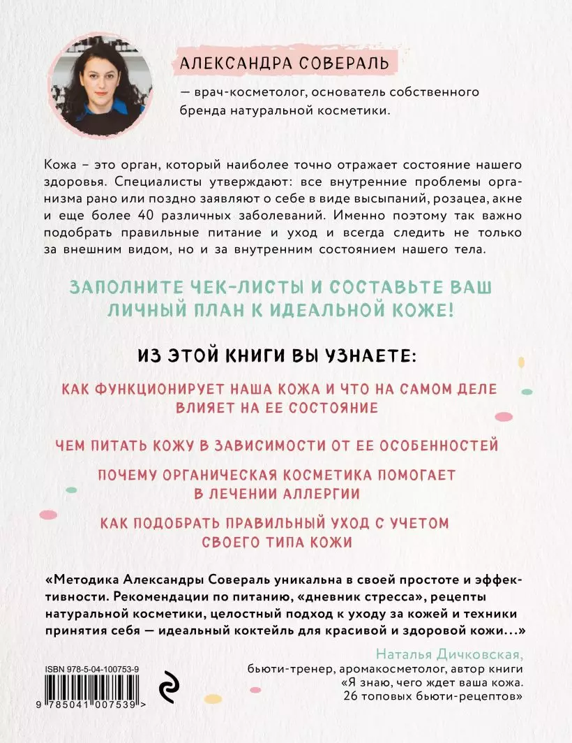 Все мы знаем, как важно понимать особенности собственной кожи. Александра Совераль - один из самых востребованных врачей-косметологов в Великобритании – раскрывает секреты безупречно красивой кожи, сияющей здоровьем. Она подробно объясняет, почему так необходимо относиться бережно к выбору уходовой и декоративной косметики, как не попасться в маркетинговые ловушки крупных косметических брендов, а также как начать понимать потребности своего организма. Помните: живя в гармонии с кожей, мы живем в гармонии с собой.