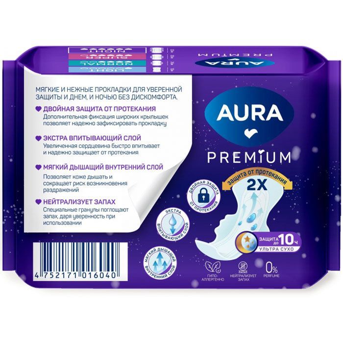 Прокладки Aura Premium Night подходят для ночного использования и имеют 100% защиту. Тонкая анатомичная форма подстраивается под особенности тела и незаметна при движении.