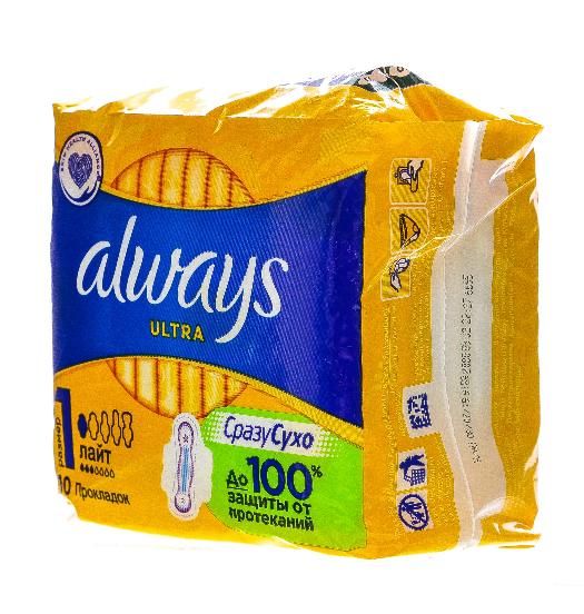 Ультратонкие прокладки Always Ultra Light с верхним слоем сеточка, благодаря которому поверхность прокладок остается практически сухой и чистой. Предназначены специально для небольших выделений, например, в первый и последний день месячных. Ультратонкие прокладки Always Ultra дарят надежную защиту в любой, даже самый интенсивный день месячных, благодаря комбинации нескольких элементов. Они содержат на 20% больше гранул геля, которые впитывают влагу и надежно запирают ее внутри прокладки в отличие от толстых прокладок с внутренним слоем из целлюлозы. К тому же у Always Ultra есть крылышки 4FIX, которые надежно удерживают прокладку на месте и защищают белье по краям.