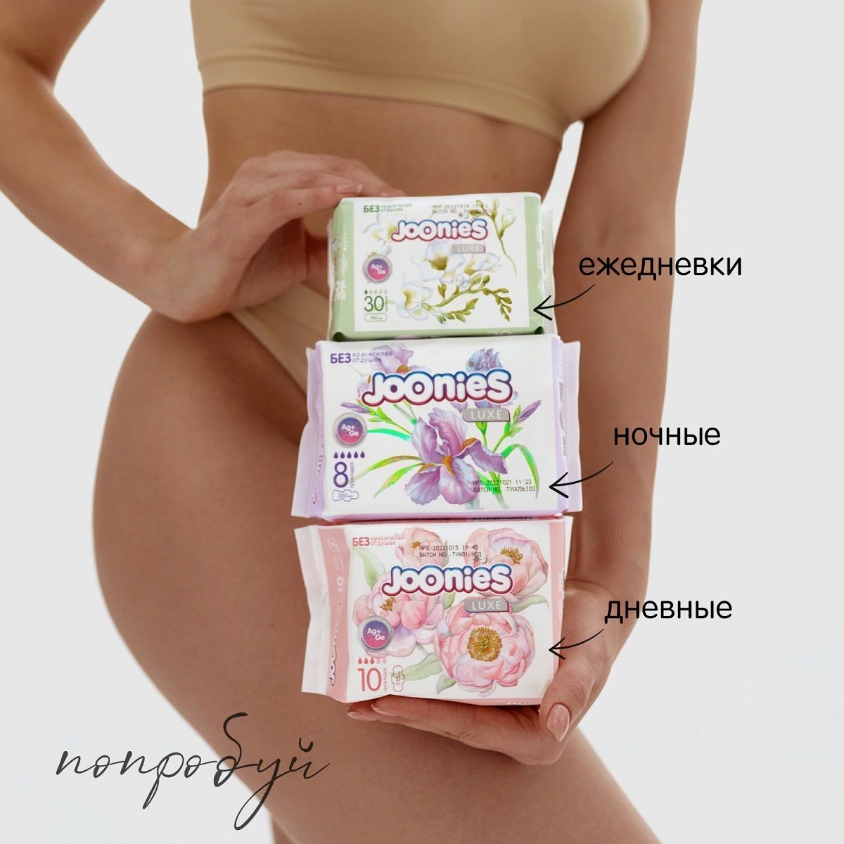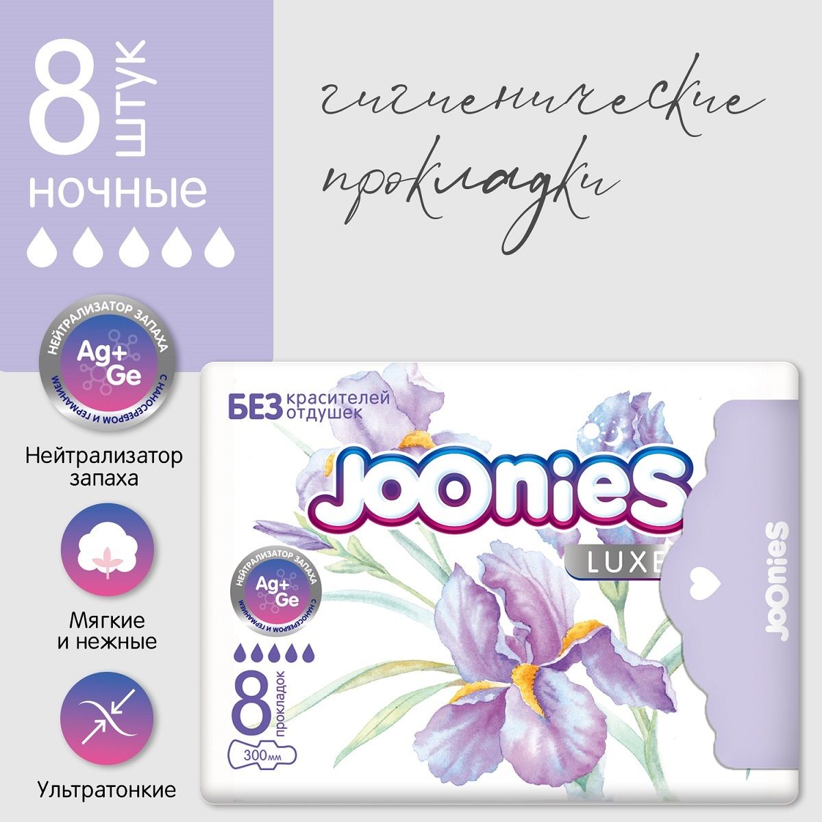 Прокладки Joonies – мягкие и нежные, не содержат красителей и отдушек. Шелковистый и дышащий верхний слой мгновенно впитывает влагу, оставляя поверхность сухой, а анатомическая форма прокладок плотно прилегает к телу, повторяя все изгибы.