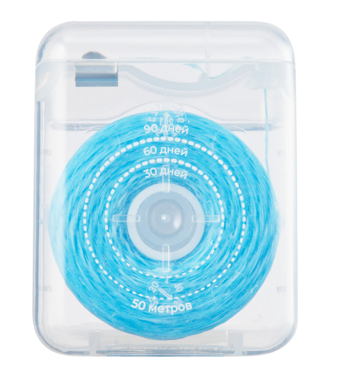 Вощеная нить из микрокристаллического воска с ярко выраженным вкусом мяты длиной 50 метров. На индивидуальной упаковке есть индикатор (на задней части блистера), который подсказывает актуальный остаток нити (3 месяца, 2 месяца, 1 месяц), нить не рвется и не волокнится.