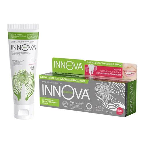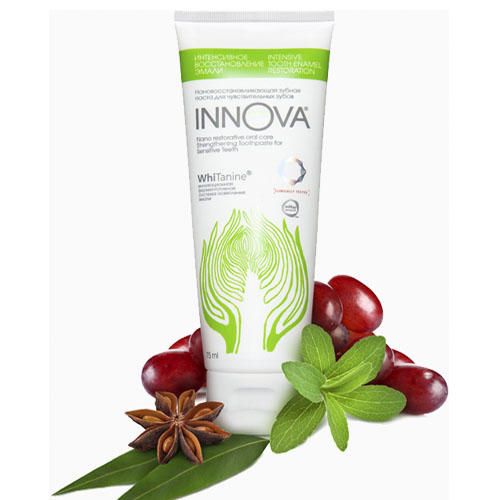 Укрепляющая зубная паста ИННОВА для чувствительных зубов с наногидроксиапатитом в терапевтической дозировке (2,25%), компонентом Кальцис, экстрактами стевии, косточек винограда и отбеливающим ферментом Tannase.