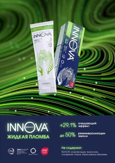 Комплексный укрепляющий эффект за счет противовоспалительного, кровоостанавливающего, десенситивного, реминерализующего и противокариесного действия. *За месяц применения зубной пасты INNOVA® происходит улучшение состояния пародонта — устранение воспалительных явлений и отечности десен, уплотнение мягких тканей десневого края, прекращение кровоточивости десен, а также укрепление твердых тканей зубов и закупорка открытых дентинных канальцев, что обеспечивает снижение чувствительности зубов.