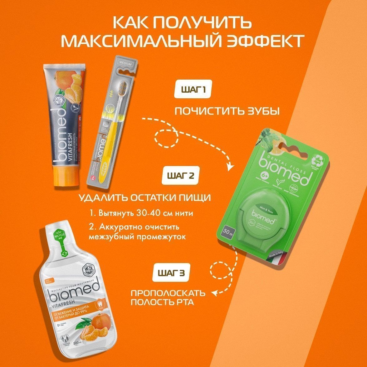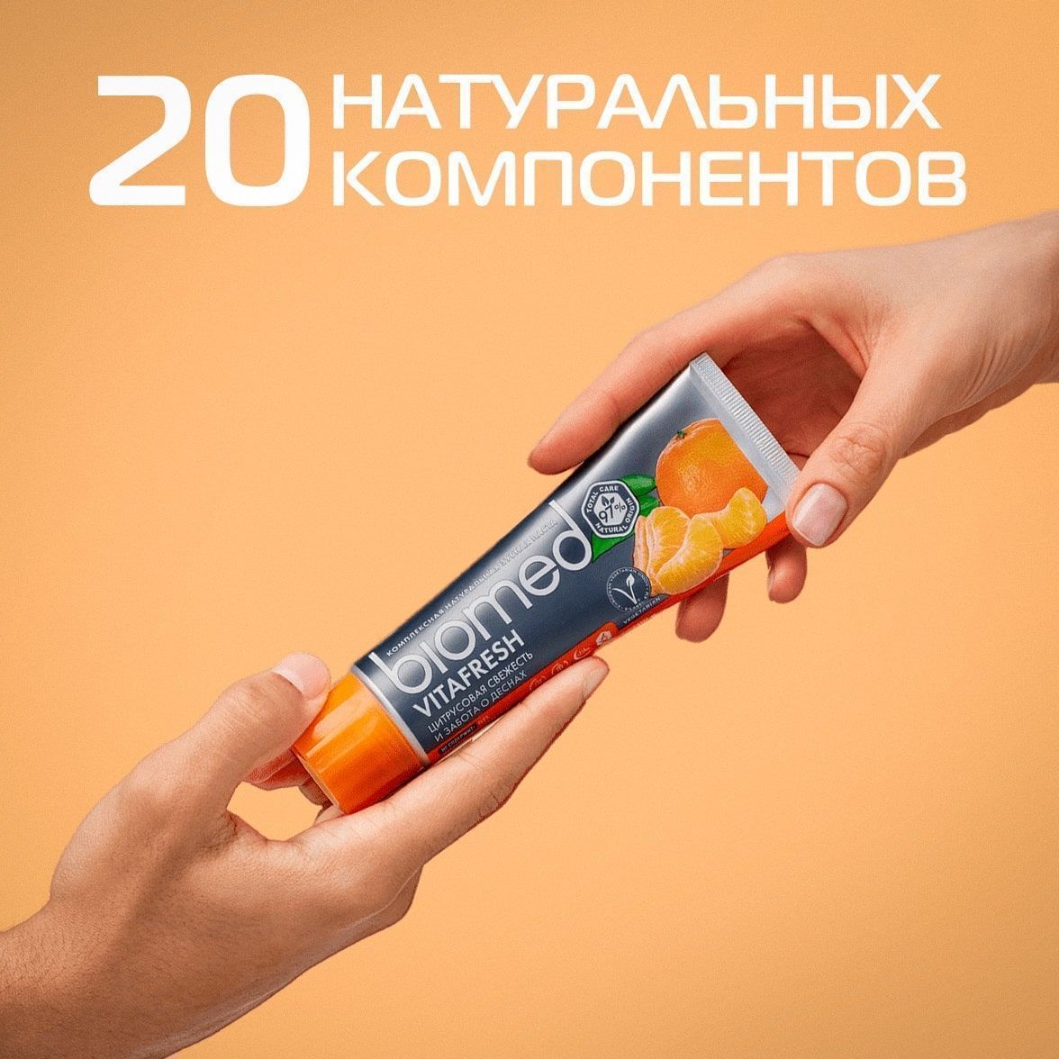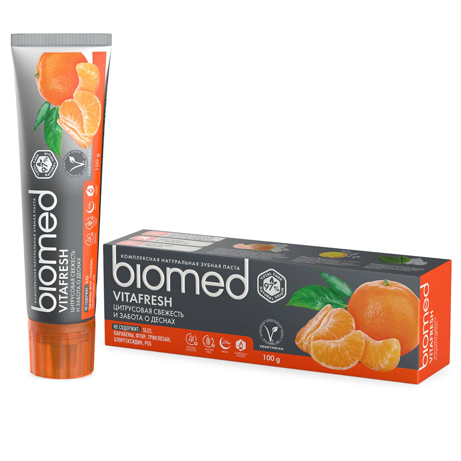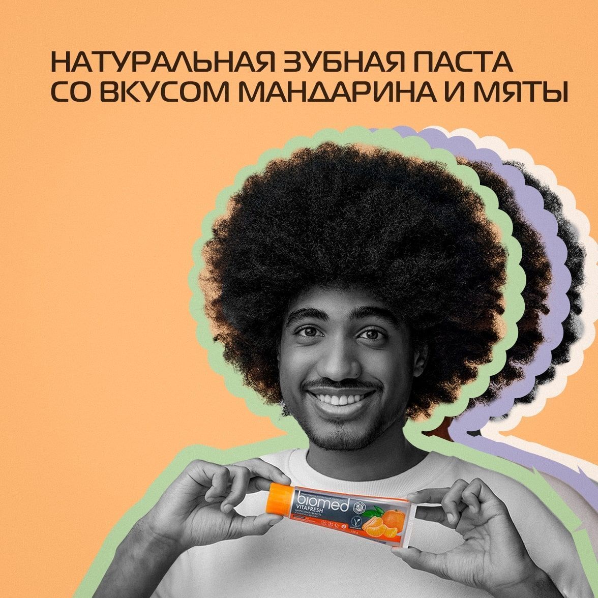 Освежающая натуральная зубная паста Biomed Vitafresh с эфирными маслами цитрусов устраняет причину неприятных запахов во рту благодаря глюконату цинка в составе, который препятствует размножению бактерий. Фермент бромелайн расщепляет белковый налет. Эфирные масла грейпфрута, мандарина, лимона и мяты придают дыханию свежесть. Рекомендована взрослым и детям от 6 лет.