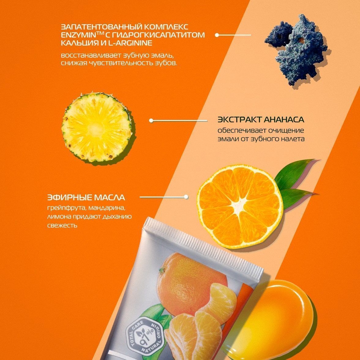 Состав: вода, диоксид кремния, гидрогенизированный гидролизат крахмала, глицерин, коко-сульфат натрия, карбоксиметилцеллюлоза, ароматизатор, бензиловый спирт, поливинилпироллидон, глюконат цинка, ксантановая камедь, глицерофосфат кальция, масло мяты перечной, диацетат глутамата тетранатрия, экстракт листьев стевии, ментил лактат, экстракт плодов ананаса, эфирное масло лимона испанского, эфиное масло цедры грейпфрута, бисаболол, экстракт листьев березы, экстракт ростков можжевельника, экстракт подорожника, аргинин, CI 19140, масло семян подсолнечника, хлорид натрия, гидроксид натрия, CI 14720 , эфирное масло мандарина, лимонен