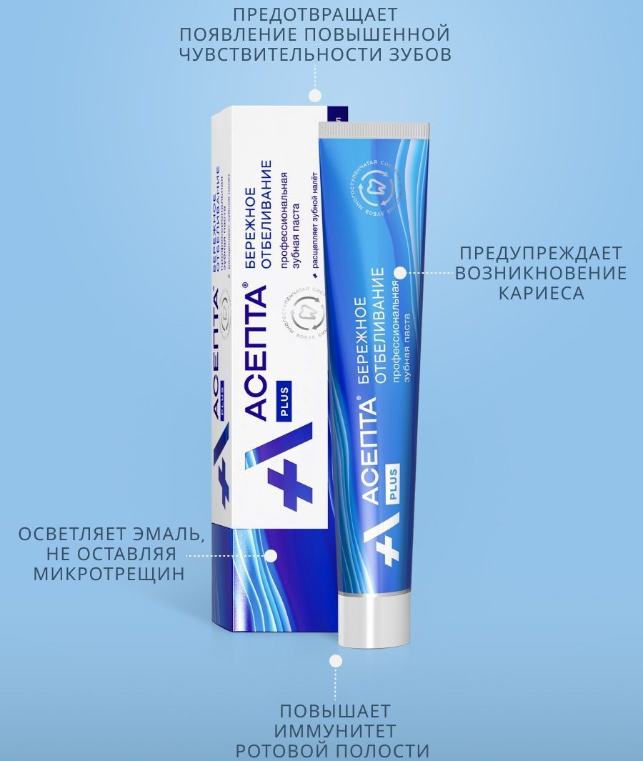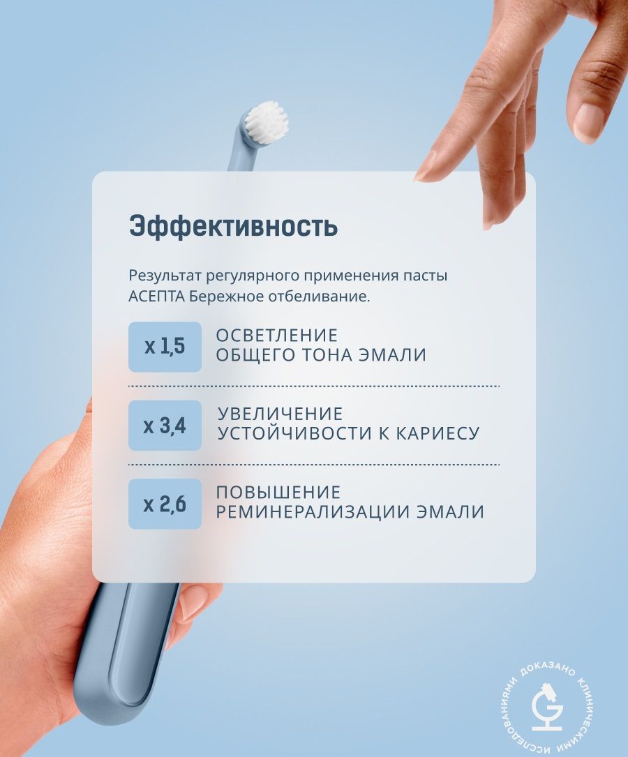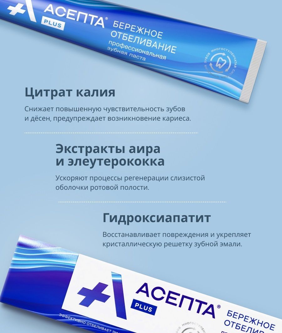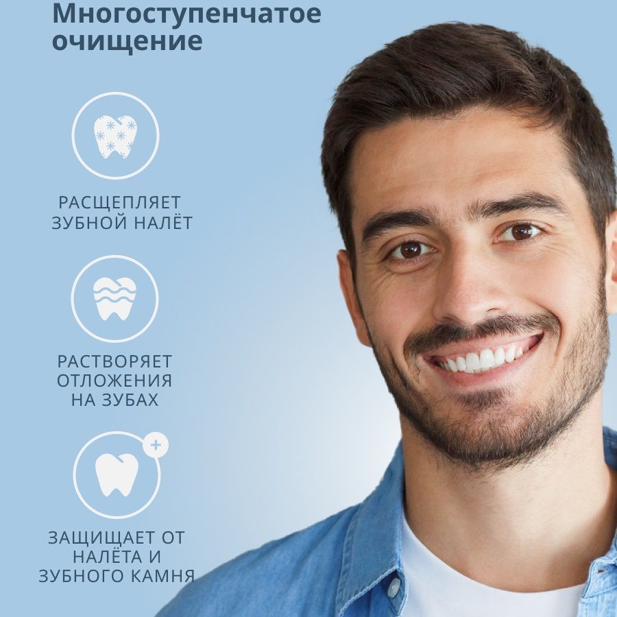 Обеспечивает эффективное и безопасное отбеливание зубов, очищение поверхностных окрашиваний зубной эмали, защищает от образования налёта и пигментаций. Предотвращает возникновение повышенной чувствительности зубов. 1. Имеет уникальную многоступенчатую систему очищения зубов, которая обеспечивает отбеливание в течение 4-х недель, не травмируя эмаль зубов. 2. Содержит гидроксиапатит и калия цитрат, которые минерализируют ослабленную эмаль зубов, предотвращают возникновение повышенной чувствительности зубов; 3. Содержит экстракты аира и элеутерококка – укрепляют дёсны, ускоряют процессы регенерации слизистой оболочки ротовой полости. Не содержит фторидов, лаурилсульфата натрия, антисептиков, агрессивных абразивов. Подходит для ежедневного применения.