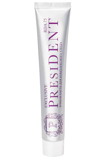 Зубная паста President Exclusive c RDA 75 предназначена для комплексного ухода за полостью рта, поддерживает микрофлору, тонизирует десны, защищает от кариеса и освежает дыхание.