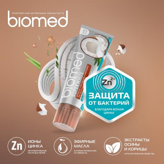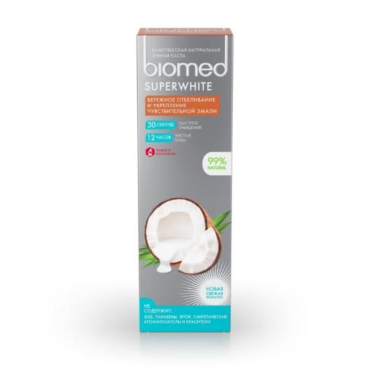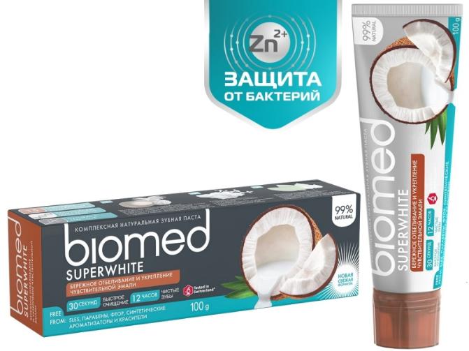 Антибактериальная отбеливающая зубная паста для чувствительной эмали BIOMED SUPERWHITE Кокос защищает от бактерий, благодаря природным экстрактам: корицы, осины, стевии, листьев березы и подорожника. Обладают антибактериальным эффектом. Комплексная натуральная зубная паста Biomed Superwhite с натуральным кокосовым маслом и экстрактом ананаса, содержащего бромелайн, для бережного осветления эмали чувствительных зубов. Здоровая белоснежная улыбка станет вашей визитной карточкой!