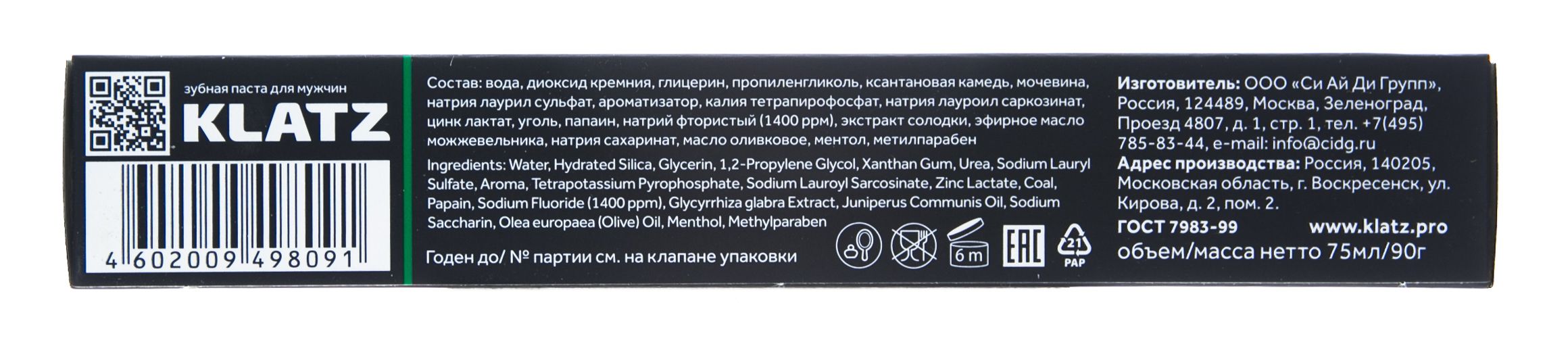 Состав: вода, диоксид кремния, глицерин, пропиленгликоль, ксантановая камедь, мочевина, натрия лаурил сульфат, ароматизатор, калия тетрапирофосфат, натрия лауроил саркозинат, цинк лактат, уголь, папаин, натрий фтористый (1400 ррм), экстракт солодки, натрия сахаринат, масло оливковое, ментол, метилпарабен