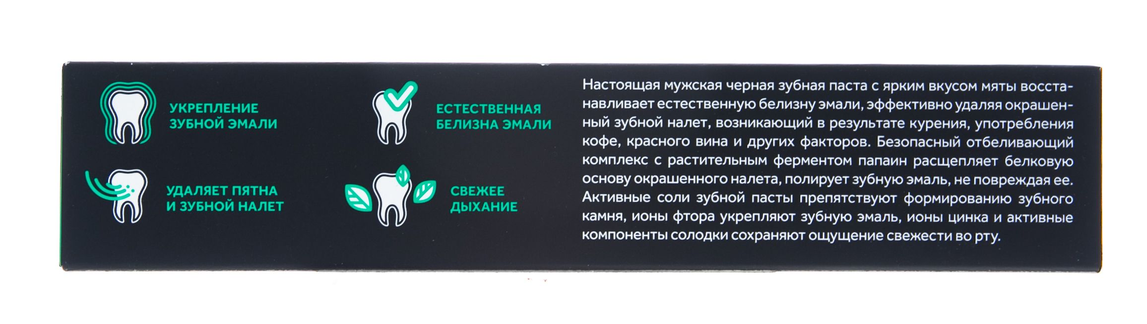 Черная зубная паста "Супер-мята" с ярким освежающим вкусом восстанавливает естественную белизну эмали, эффективно удаляя окрашенный зубной налет, возникающий в результате курения, употребления кофе, красного вина и других факторов.