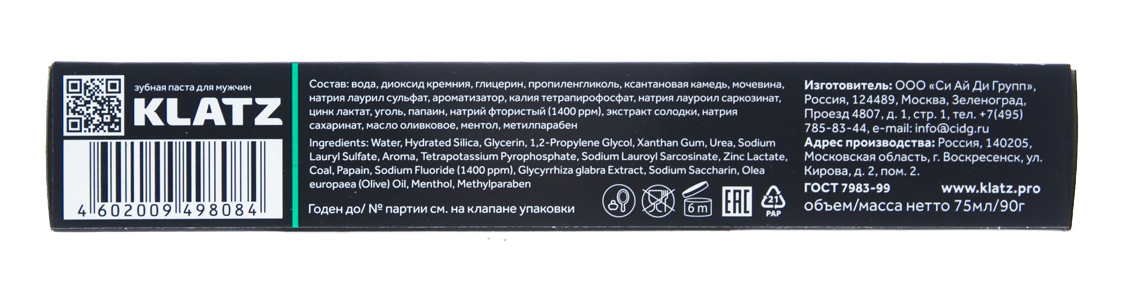 Состав: вода, диоксид кремния, глицерин, пропиленгликоль, ксантановая камедь, мочевина, натрия лаурил сульфат, ароматизатор, калия тетрапирофосфат, натрия лауроил саркозинат, цинк лактат, уголь, папаин, натрий фтористый (1400 ррм), экстракт солодки, натрия сахаринат, масло оливковое, ментол, метилпарабен