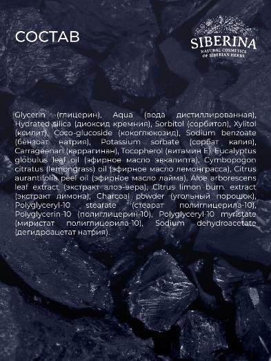 Состав: glycerin (глицерин), aqua (вода дистиллированная), hydrated silica (диоксид кремния), sorbitol (сорбитол), xylitol (ксилит), coco-glucoside (кокоглюкозид), sodium benzoate (бензоат натрия), potassium sorbate (сорбат калия), carrageenan (каррагинан), tocopherol (витамин е), eucalyptus globulus leaf oil (эфирное масло эвкалипта), сymbopogon citratus (lemongrass) oil (эфирное масло лемонграсса), сitrus aurantifolia peel oil (эфирное масло лайма), aloe arborescens leaf extract (экстракт алоэ-вера), сitrus limon burn. extract (экстракт лимона), charcoal powder (угольный порошок), polyglyceryl-10 stearate (стеарат полиглицерила-10), polyglycerin-10 (полиглицерин-10), polyglyceryl-10 myristate (миристат полиглицерила-10), sodium dehydroacetate (дегидроацетат натрия)