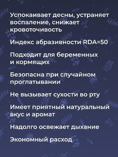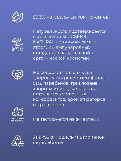 Создано из природных компонентов высокого качества. Не содержит фтора, sls, парабенов, триклозан, агрессивных абразивов, искусственных консервантов, ароматизаторов и красителей.